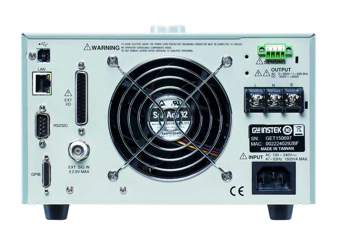 • Output Rating: AC 0 – 350 Vrms, DC 0 - ± 500 V • Output Frequency up to 999.9 Hz • DC Output (100% of Rated Power) • Measurement Items: Vrms, Vavg, Vpeak, Irms, IpkH, Iavg, Ipeak, P, S, Q, PF, CF • Voltage and Current Harmonic Analysis(THDv, THDi) • Remote Sensing Capability • OVP, OCP, OPP, OTP, AC Fail Detection and Fan Fail Alarm. • Support Arbitrary Waveform Function • Output Capacity: 500VA/ 1000VA • Customized Phase Angle for Output On/Off • Sequence and Simulation Function(up to 10 sets) • Interface: USB, LAN(std.); RS-232+GPIB(opt.) • Built-in External Control I/O and External Signal Input • Built-in Output Relay Control • Memory Function (up to 10 sets) • Built-in Web ServerDescription