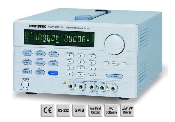 The PSM-Series is single output / dual range, 120W or 200W, programmable linear DC power supplies. OVP, OCP, OTP, and, output On/Off control protect the PSM-Series and their loads from unexpected conditions. High resolution, high regulation, and low ripple are maintained at 1mV/1mA, 0.01%, and <350 Vrms, respectively. Operation and configuration is simplified with a digital interface and a clear LCD display. Standard features include store/recall output memories, automatic stepping with timers for continuous testing and self-testing, and software calibration features to reduce maintenance efforts. SCPI programming, LabVIEW drivers, RS-232C, and GPIB interfaces enable easy automated test system integration and remote control. The PSM-Series is an ideal choice for high precision applications such as QA verification and product development.Accessories
