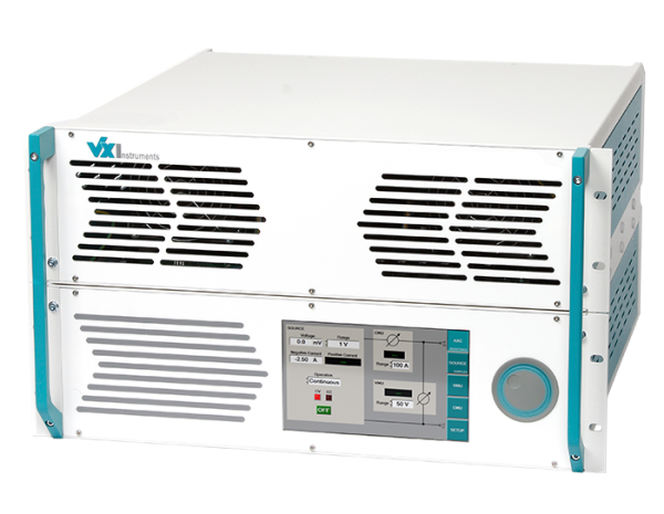 The potential-free high-current SMUs of the AXC family are characterized by their very fast, low-noise analogue power amplifiers. This allows fully regulated current pulses to be realized under one millisecond at peak currents above 500 A. Functions such as the start of a pulse can be activated by hardware triggers and thus guarantee very short response times. The throughput in the test procedure is significantly increased and at the same time less energy is introduced into the component to be tested. This leads to less heating in the component itself, which is crucial, for example, for the test of bare dies. The extremely compact design of the devices in 19“ format with only 6 U saves space in the test system.Options